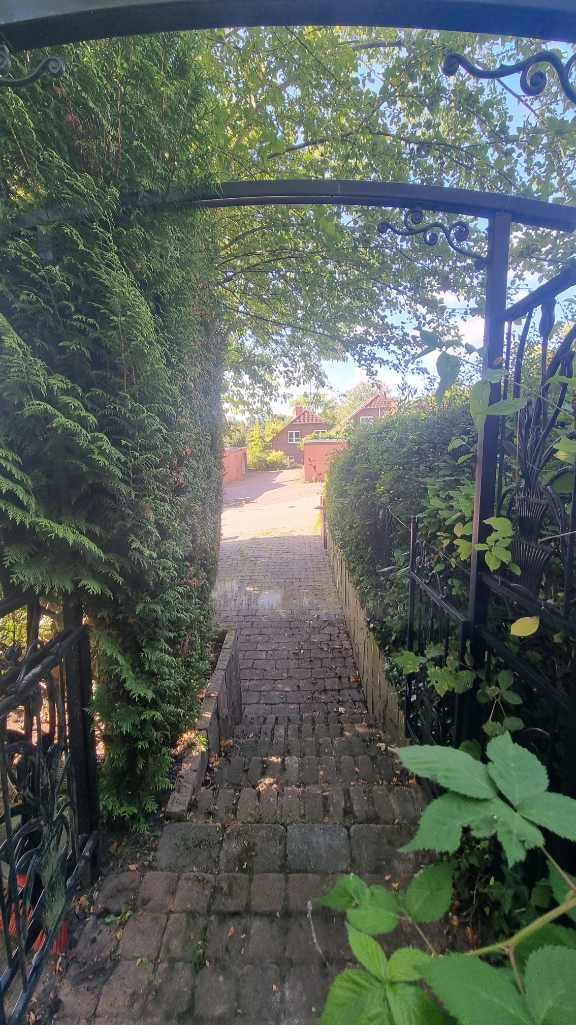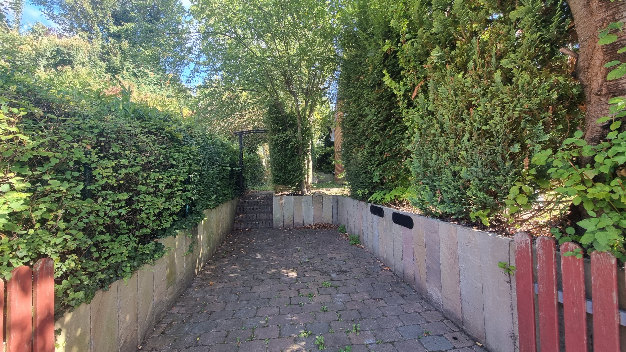 Die Zuwegung von der Vorderseite erfolgt mittels eines gepflasterten Fußweges.