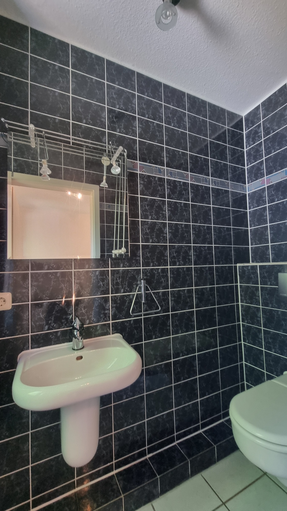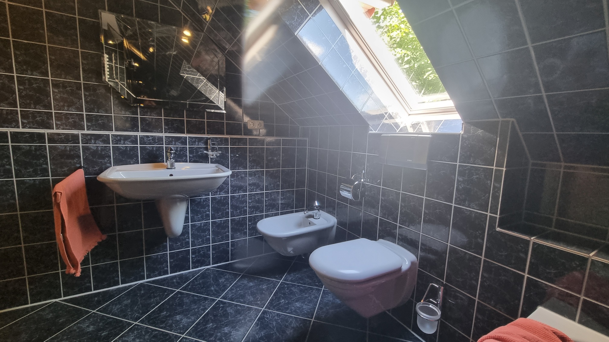Die Bäder sind Deckenhoch in extravagantem schwarz  und im Keller weiß gefliest.
