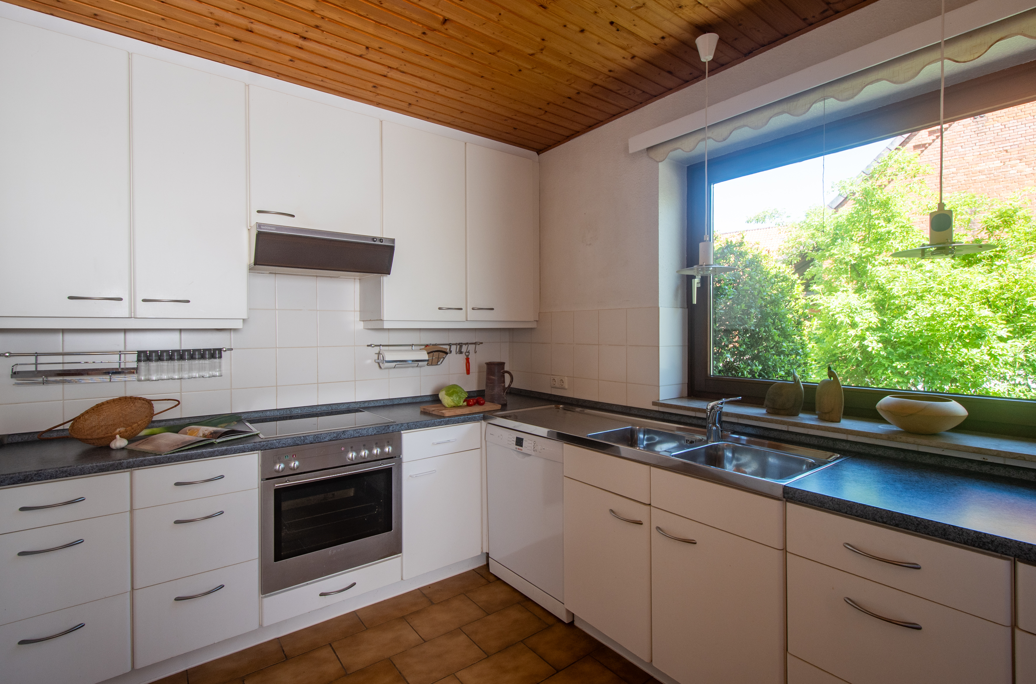 In der Küche ist eine ältere weiße Einbauküche vorhanden.