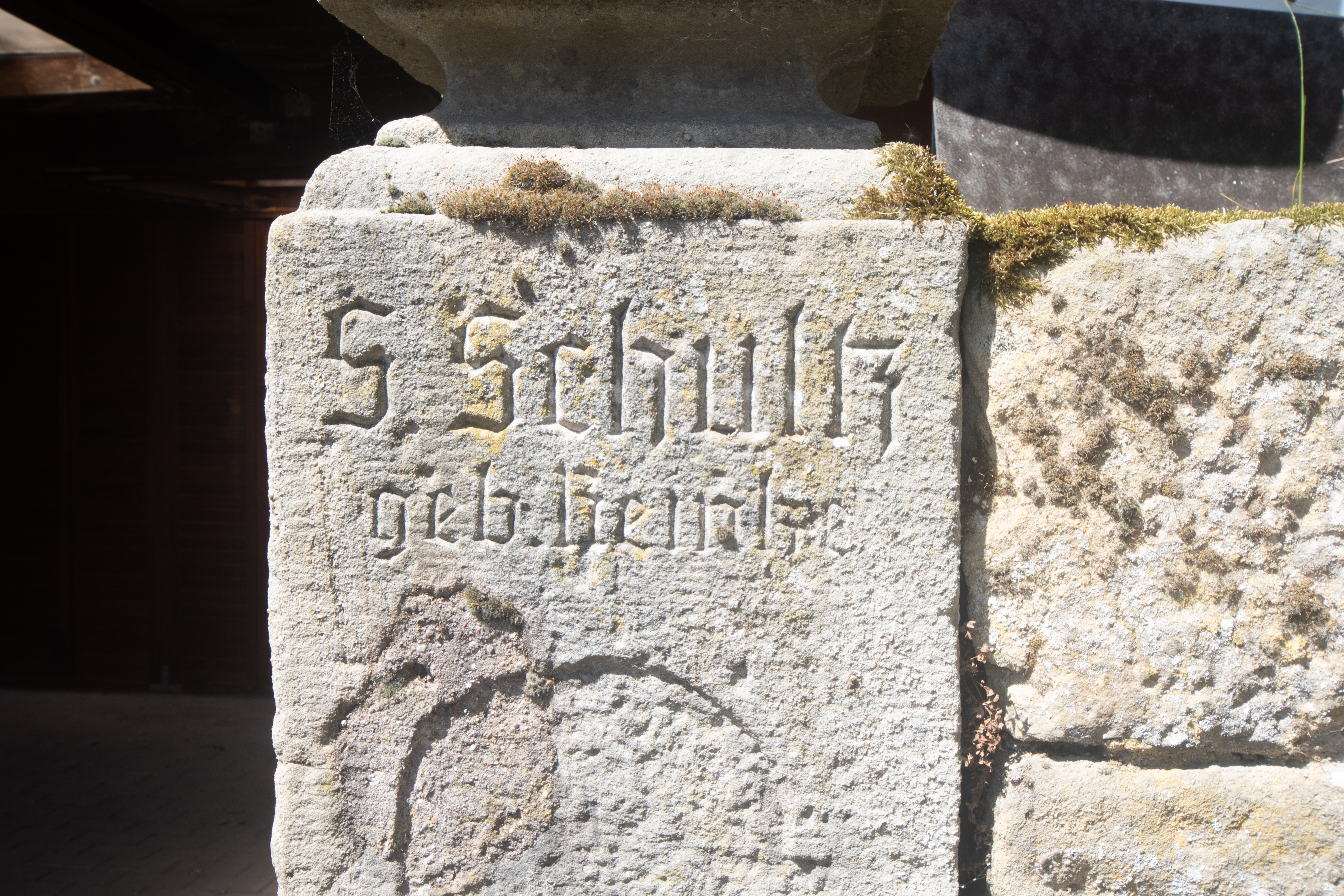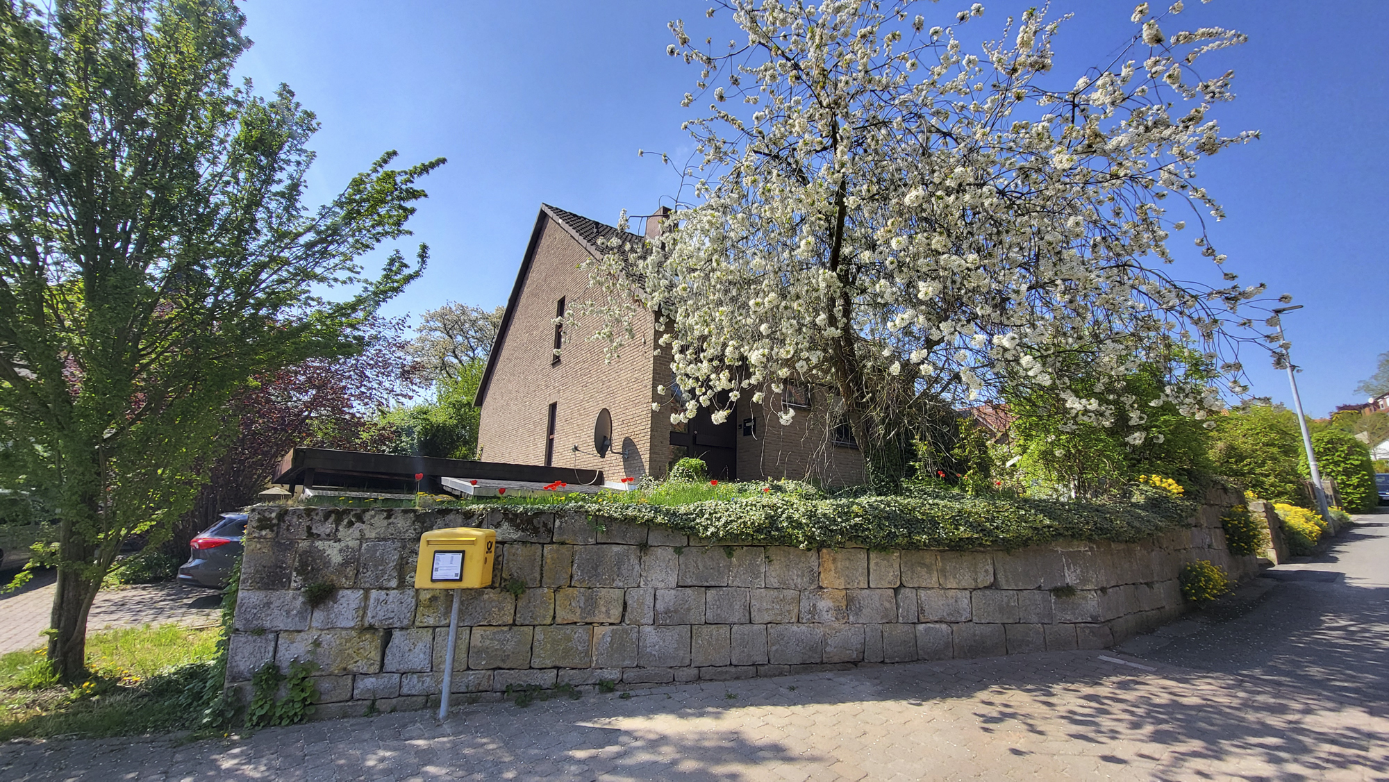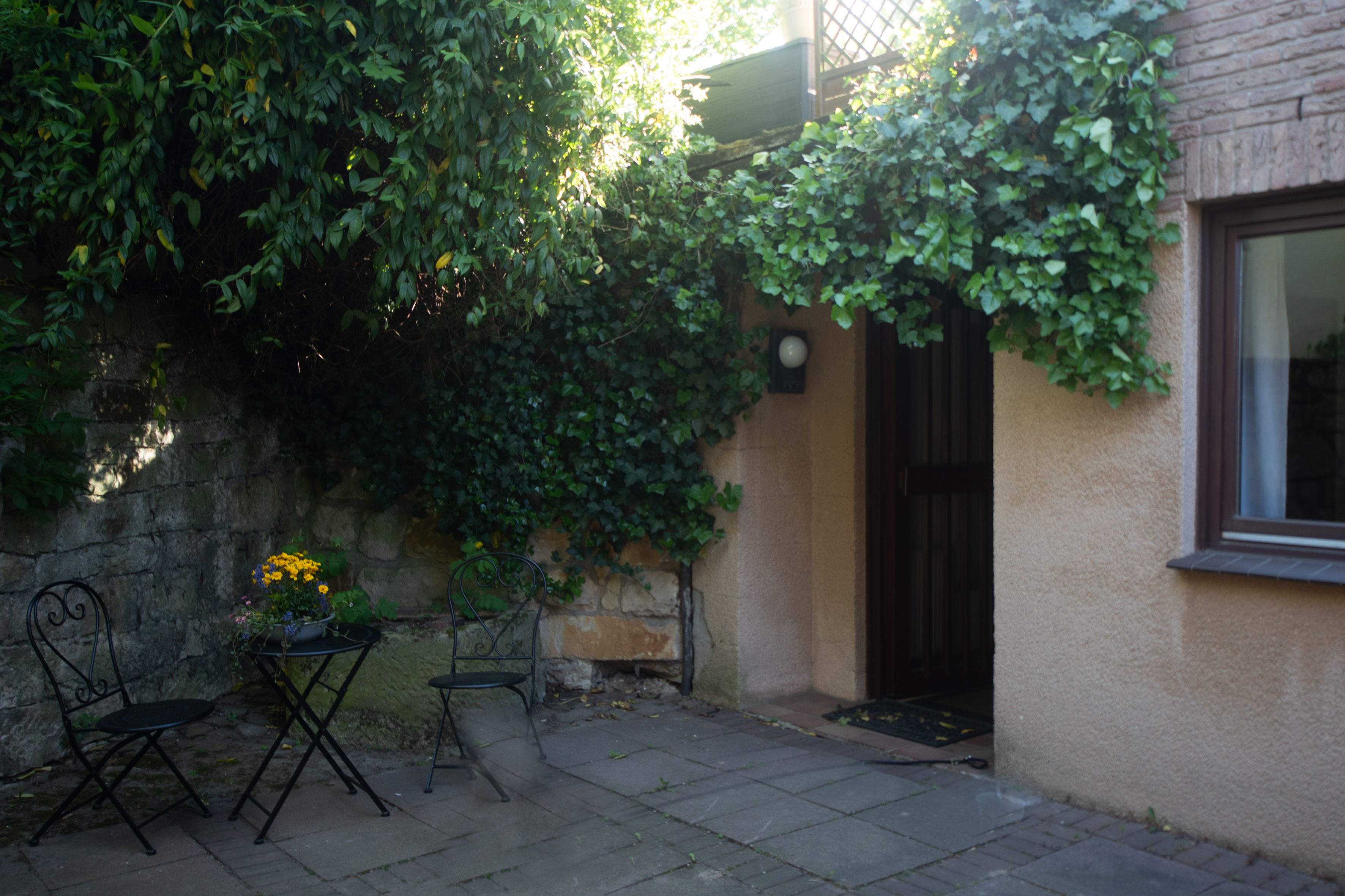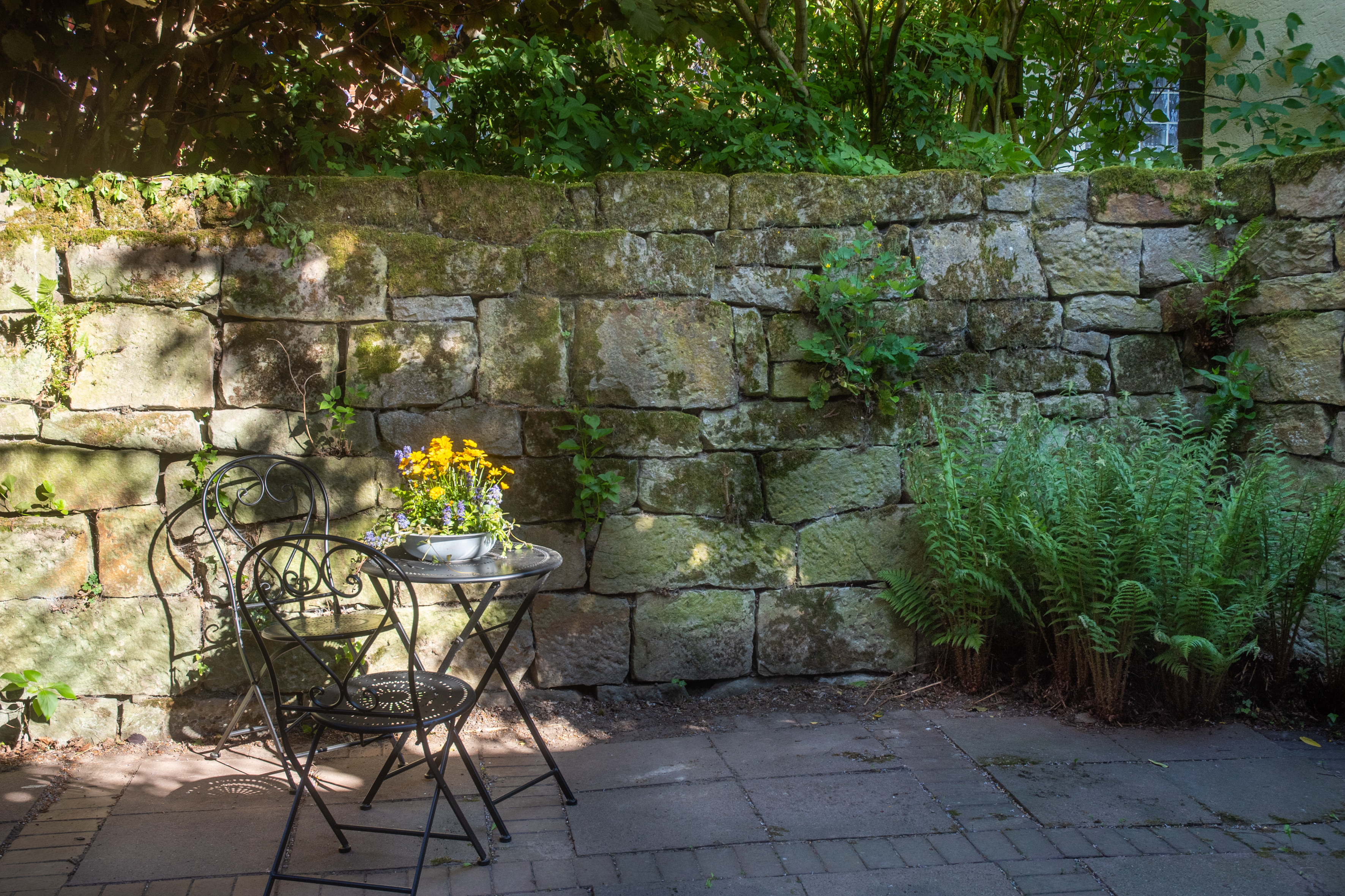 Das Grundstück ist  im vorderen und seitlichen Bereich mit einer Sandsteinmauer eingefasst und eine Sandsteinmauer bildet auch den Abschluss zum Nachbarn im Bereich der Einliegerwohnung mit vorgelagertem Innenhof. Dieser mit alten Sandsteinen wunderschön gestaltete Grundstücksteil bildet einen geschützten, mediterran anmutenden Innenhof. und wirkt wie eine malerische Grotte.