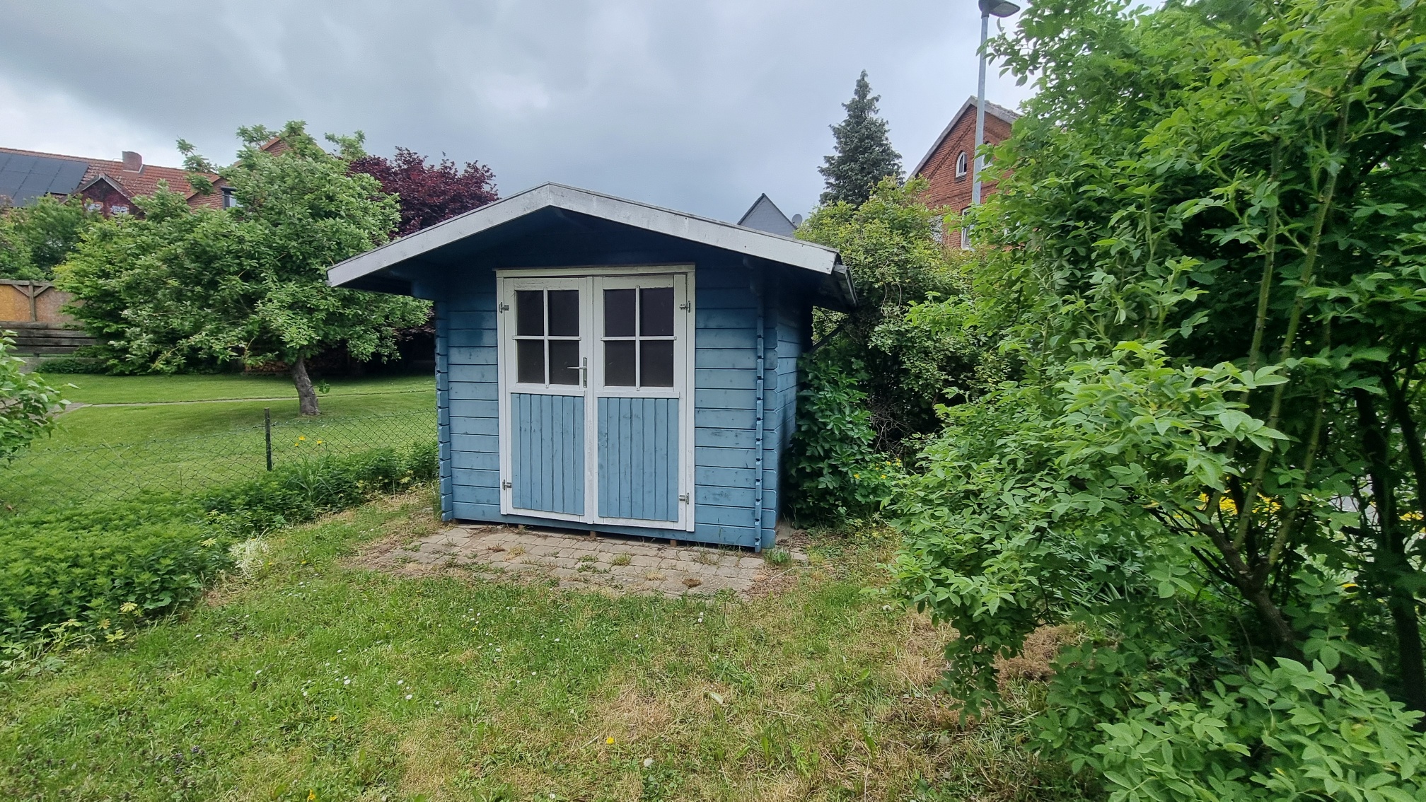 Geht man rechts ums Haus, gibt es einen etwas tiefer liegenden Bereich für Spielmöglichkeiten und es findet sich ein kleines Gartenhaus.