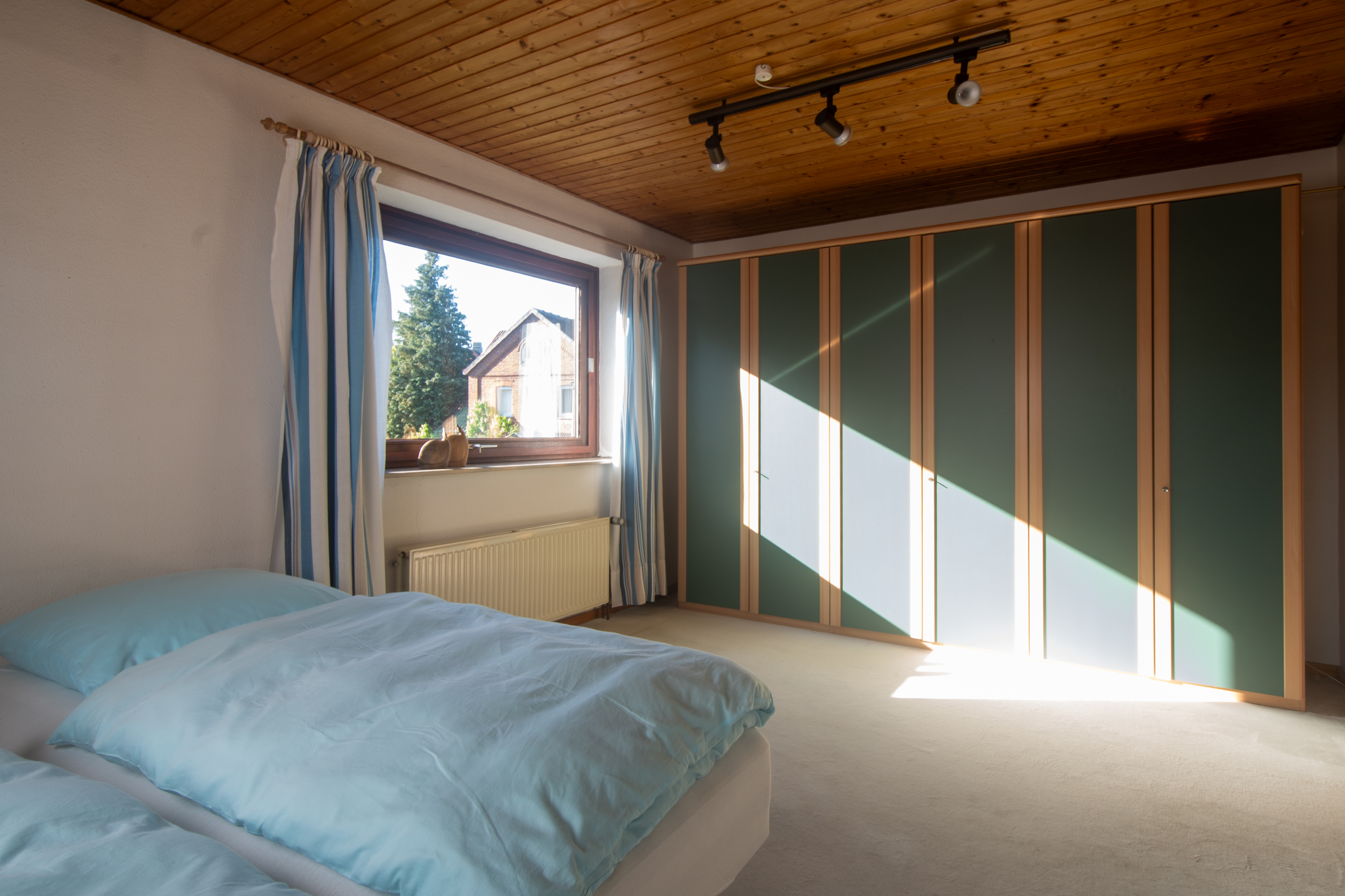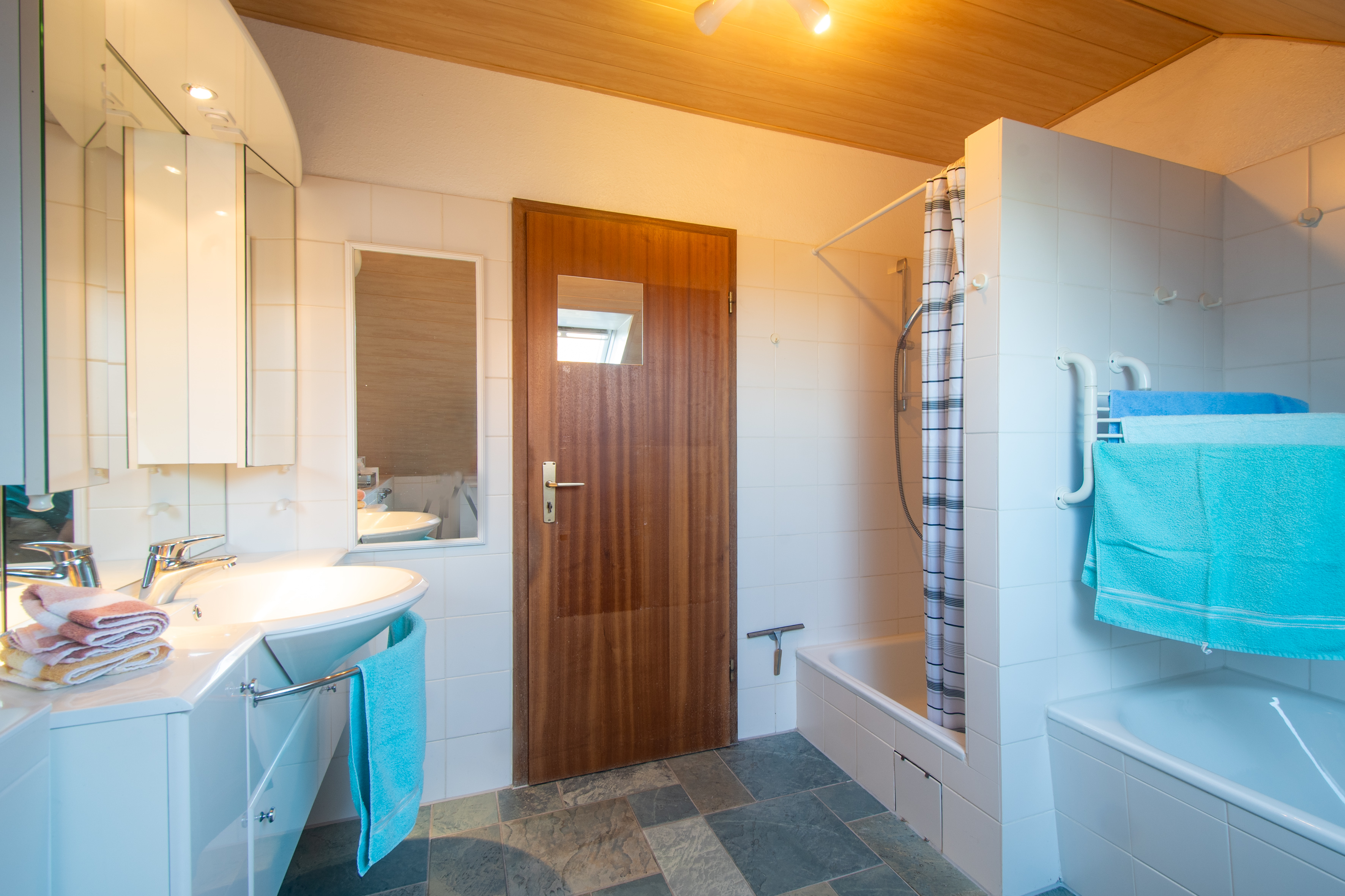 Im Obergeschoss befinden sich drei Schlafräume und ein großes Badezimmer mit Wanne und Dusche.