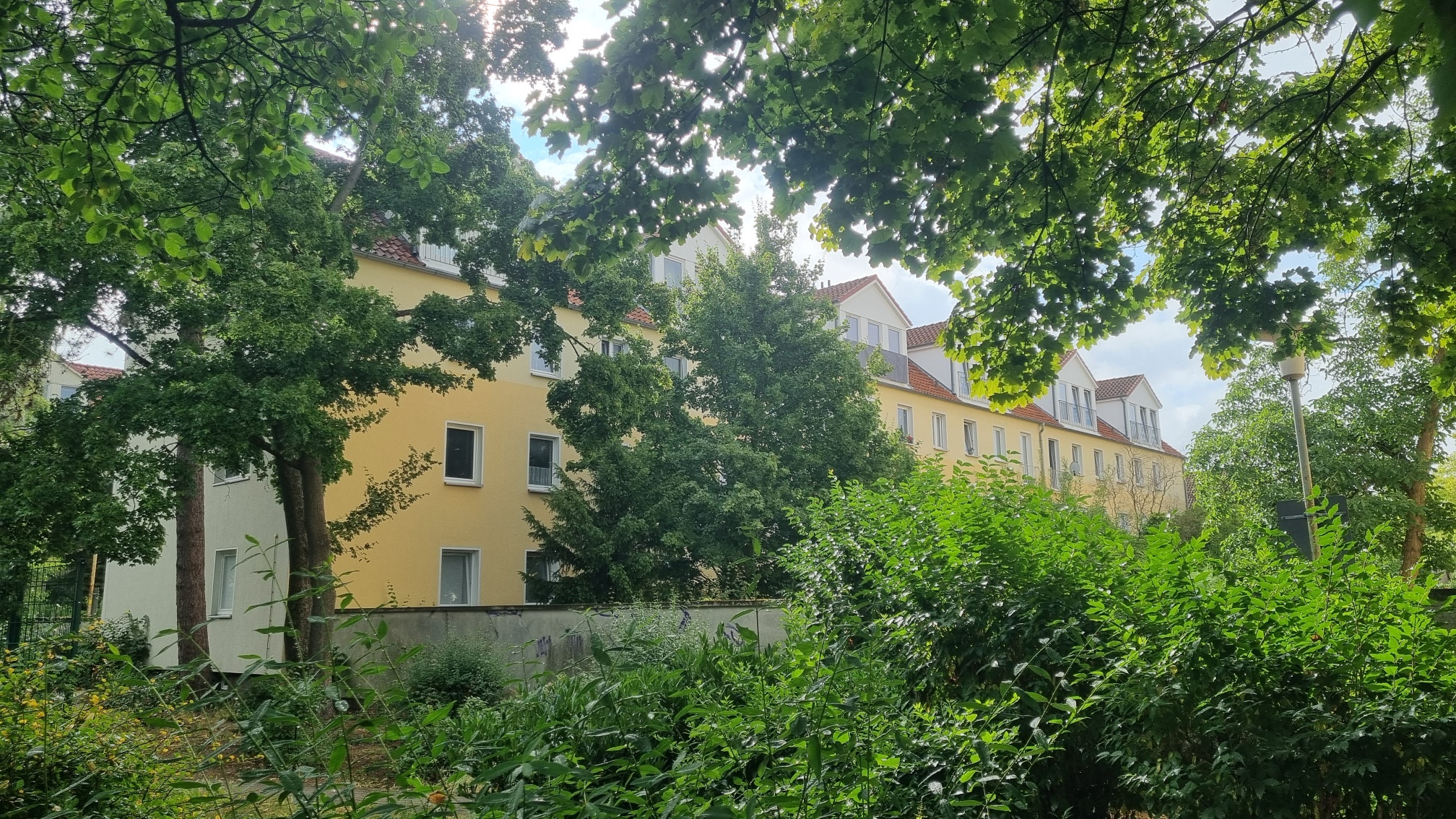 Die Häuserzeile gehört zu einer in offener Bauweise mit viel Grün umgebenen Gesamtanlage.